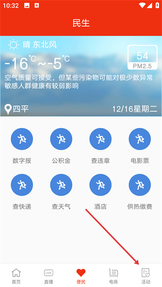 1、在【便民】页面,您可以查询本地天气、PM2.5等实时信息,还能使用数字报阅读、公积金查询等民生服务功能;若需切换至活动页面,点击底部的【活动】按钮即可。