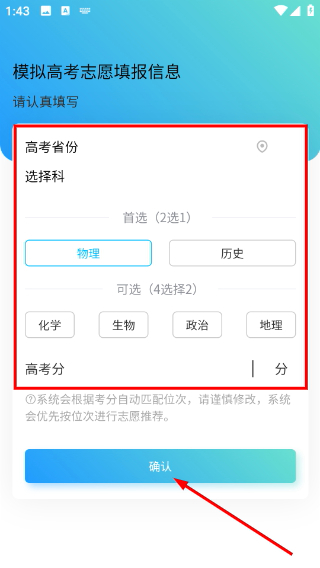1、在模拟高考志愿填报界面,需先选定【高考省份】,接着选择报考的科目,输入【高考分数】后,系统将依据这些信息推荐志愿。