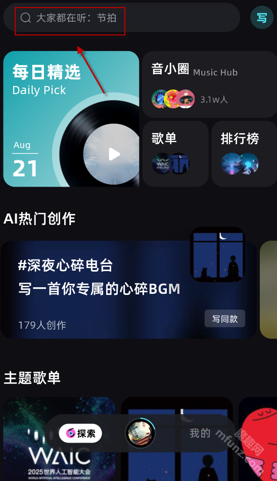 1、打开音潮,点击左下角的“探索”。