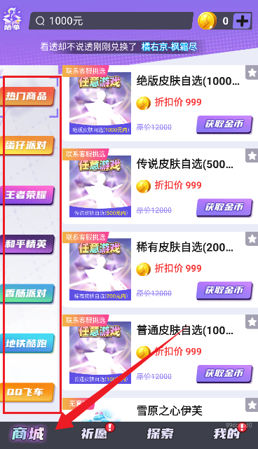 1、打开皮易得,在商城中,我们可以看到各类游戏的的皮肤商品。