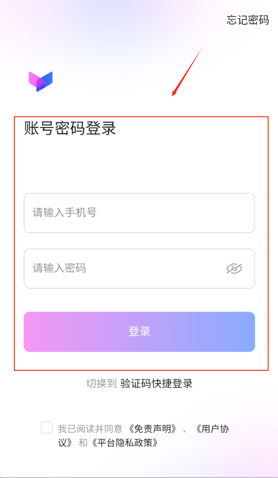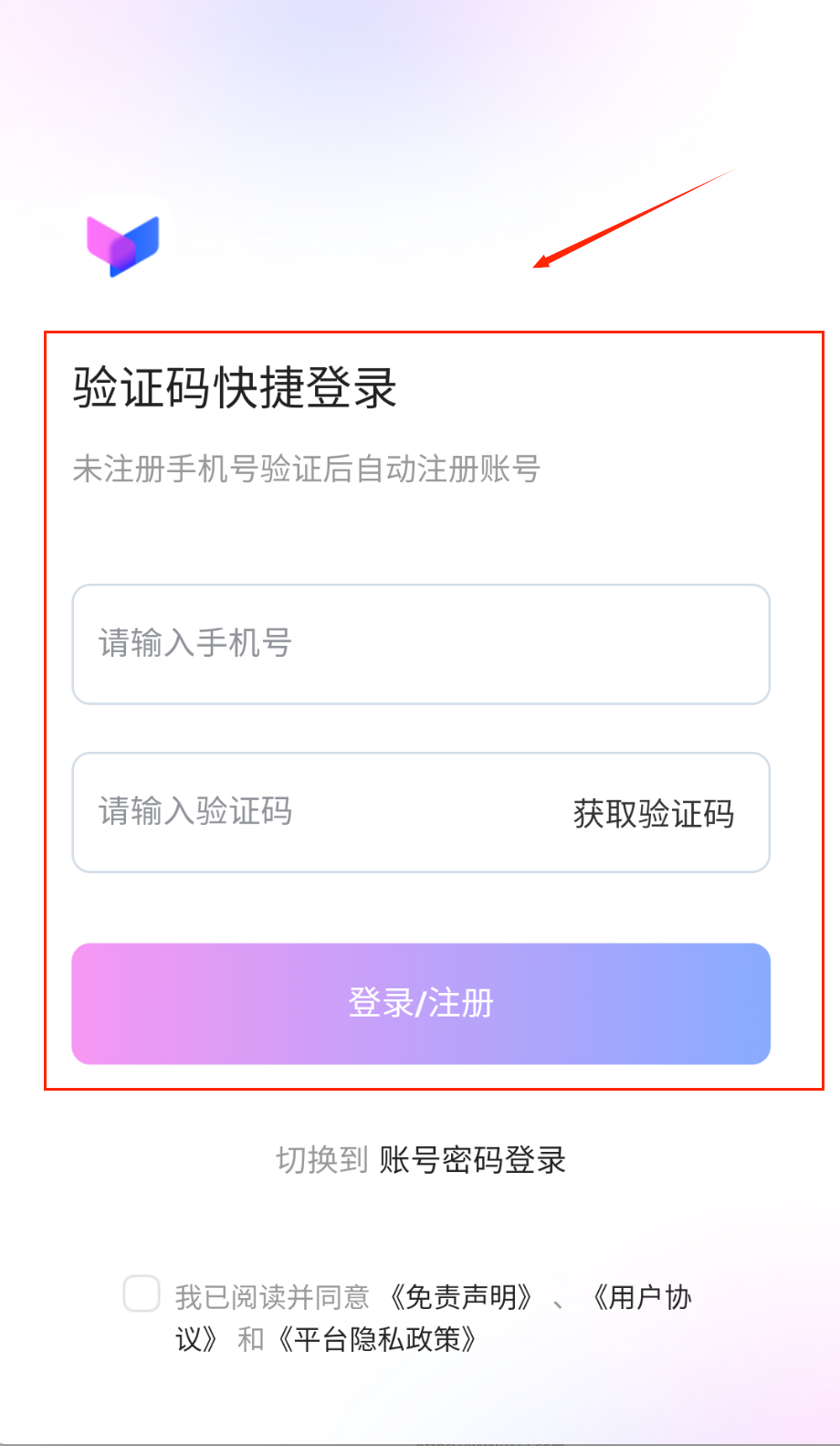 2、要是您觉得输入密码比较麻烦,也可以选择更便捷的验证码登录方式,只需在手机号输入框填写您的号码,然后点击获取验证码即可。