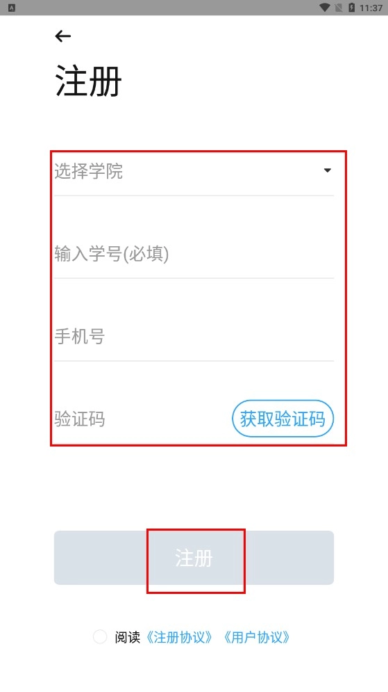 3、若选择注册账号,在注册页面选择学院、输入学号、手机号,点击【获取验证码】,输入验证码后点击【注册】完成注册。