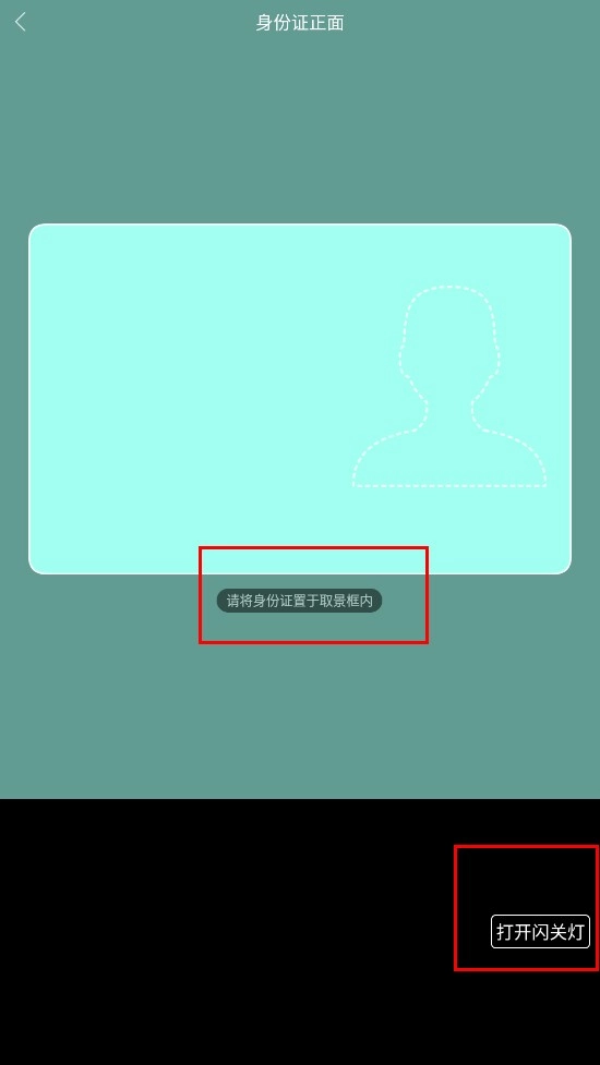4、将身份证置于取景框内,可点击【打开闪关灯-按钮】辅助扫描。