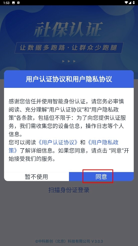 2、阅读用户认证协议和隐私协议后,点击【同意-按钮】。
