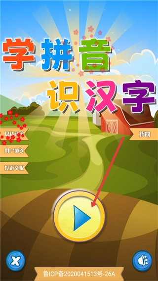 在“学拼音识汉字”应用的启动页面,点击页面中间的播放按钮,即可进入学习板块的选择界面。