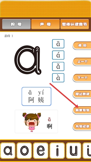 3、在韵母“a”的学习界面,点击“我要写写”按钮,进入书写练习页面。