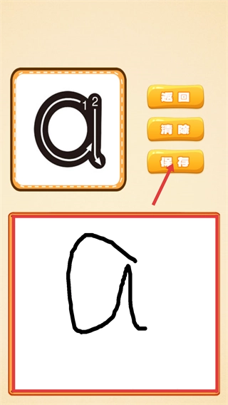 4、在书写练习页面,按照笔画提示完成“a”的书写后,点击“保存”按钮,完成书写练习。