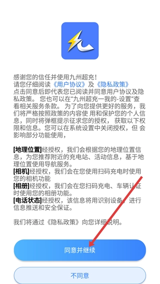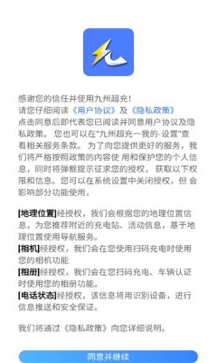 在使用九州超充服务前,您需要仔细阅读《用户协议》与《隐私政策》,在知晓地理位置、相机等权限的具体用途后,点击“同意并继续”按钮,才能正式使用该服务。