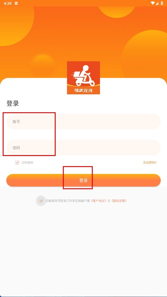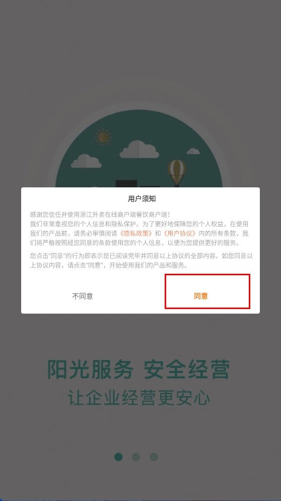 1、点击【同意】按钮,以确认接受《隐私政策》与《用户协议》,随后进入浙江外卖在线商户端。