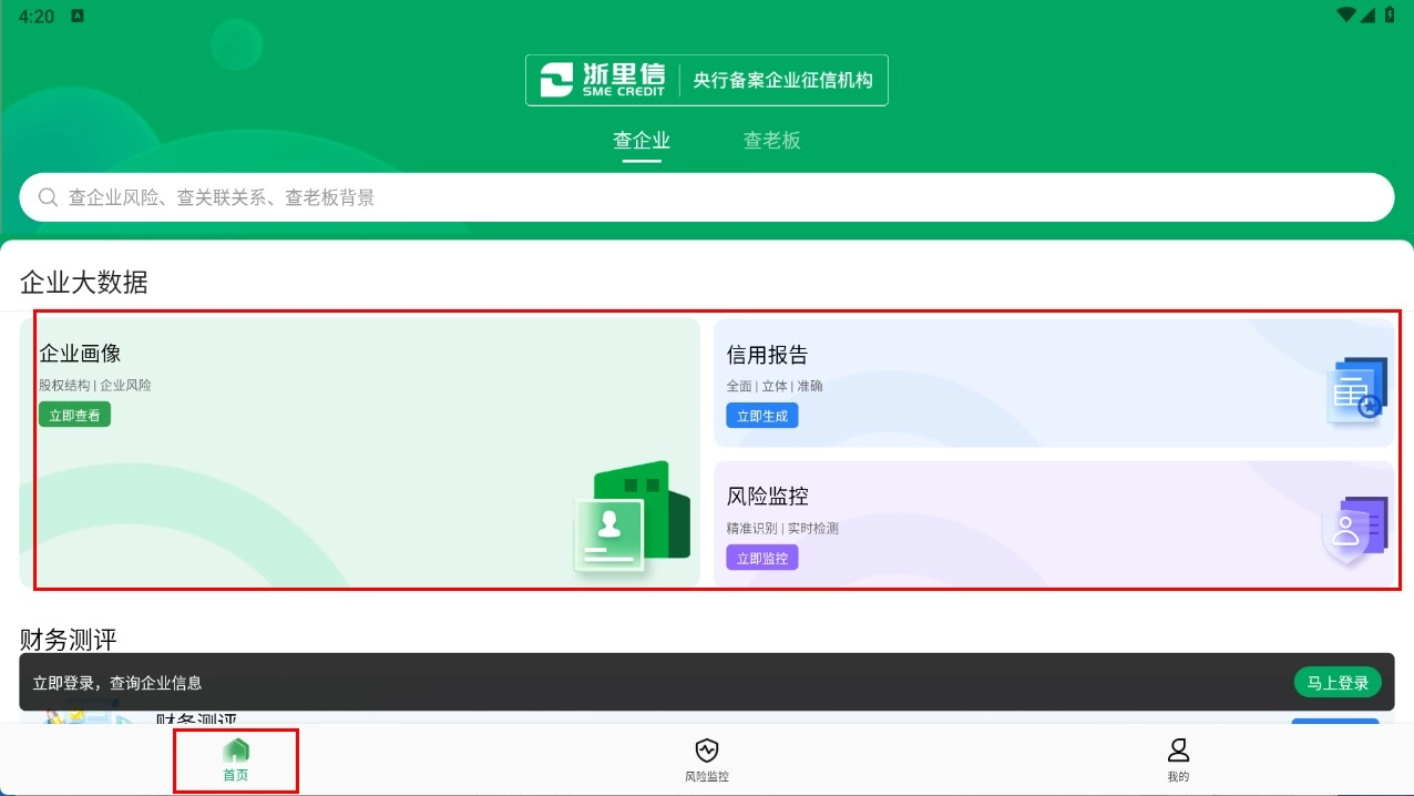 4、登录后进入首页,可使用【企业画像】【信用报告】【风险监控】功能,查询企业相关信息。