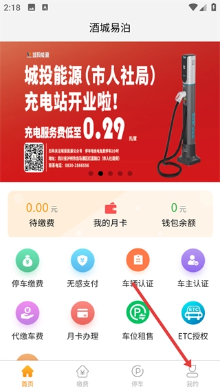 1、打开酒城易泊APP后,在首页找到右下角的【我的】按钮并点击,即可进入个人中心页面。