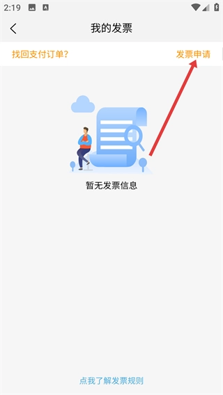 3、在“我的发票”页面,点击右上角【发票申请】,进入发票申请页面。