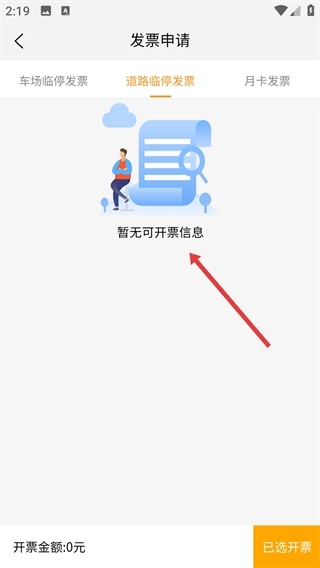 4、在发票申请页面,可选择“车场临停发票”“道路临停发票”“月卡发票”等类型,查看并申请对应发票。
