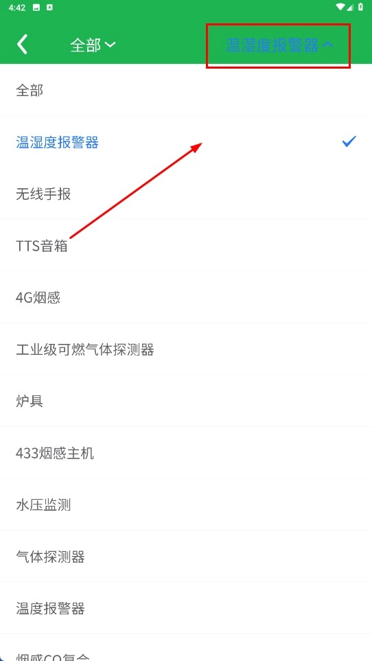 2、选择【温湿度报警器-设备类型】,进行设备筛选。