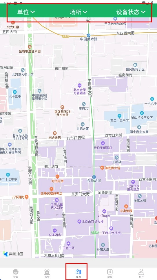 4、进入【总览-界面】,通过【单位-场所-设备状态-筛选栏】,查看设备分布及状态。