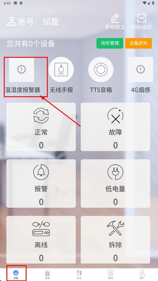 1、在【设备-界面】板块中,点击【温湿度报警器】对应的图标,即可进入设备管理相关流程。