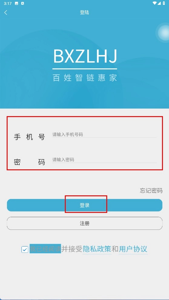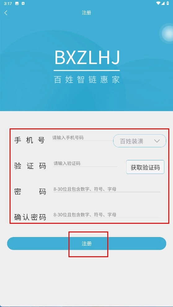 4、若未注册,在注册界面输入手机号、验证码、密码,点击【注册】按钮完成注册。