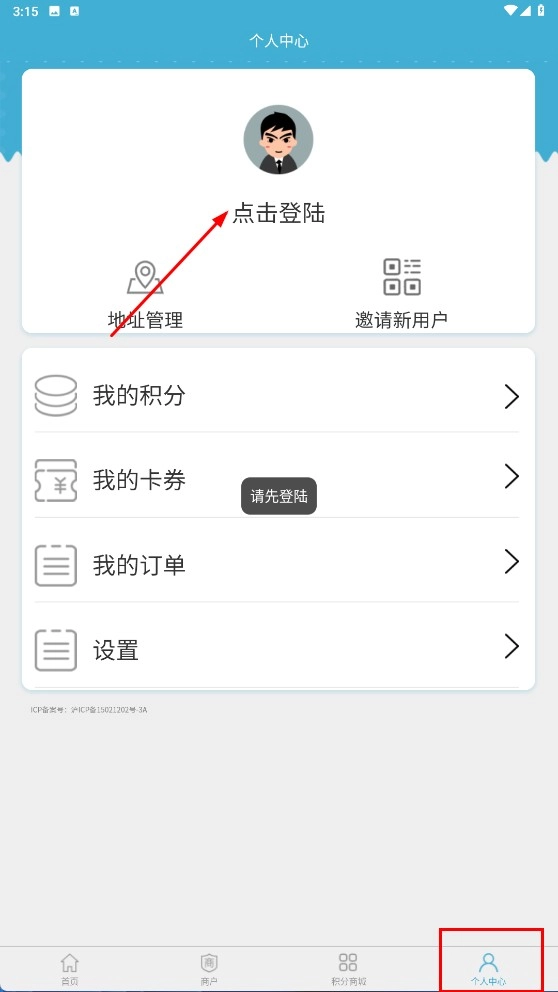 2、进入【个人中心】,点击【点击登陆】,进入登录界面。