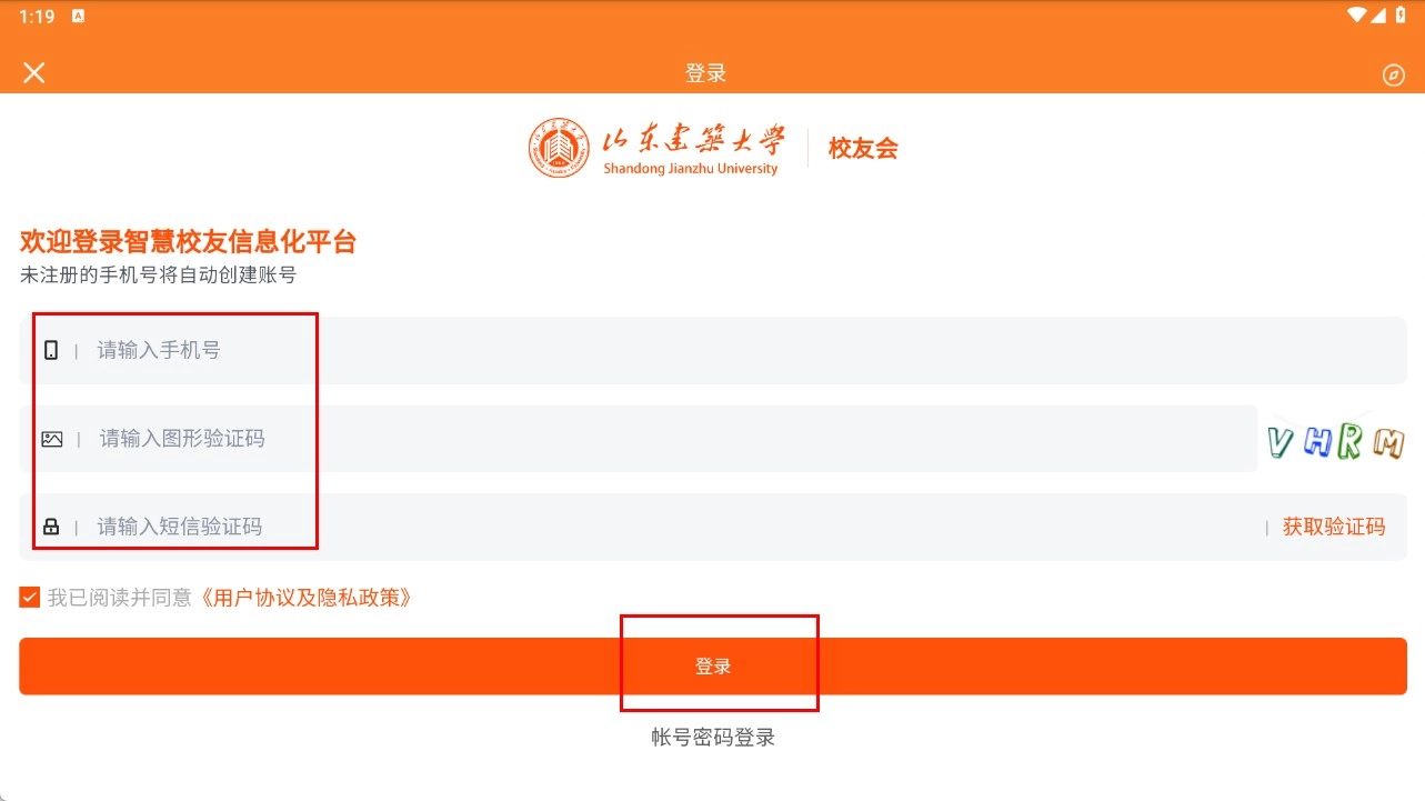 3、校友登录时,输入手机号、图形验证码,点击【获取验证码】并填写短信验证码后,点击【登录】完成登录。
