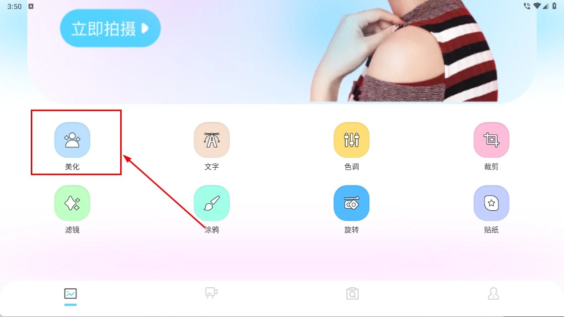 1、点击【美化】功能,进入图片美化环节,开启人像美化操作。