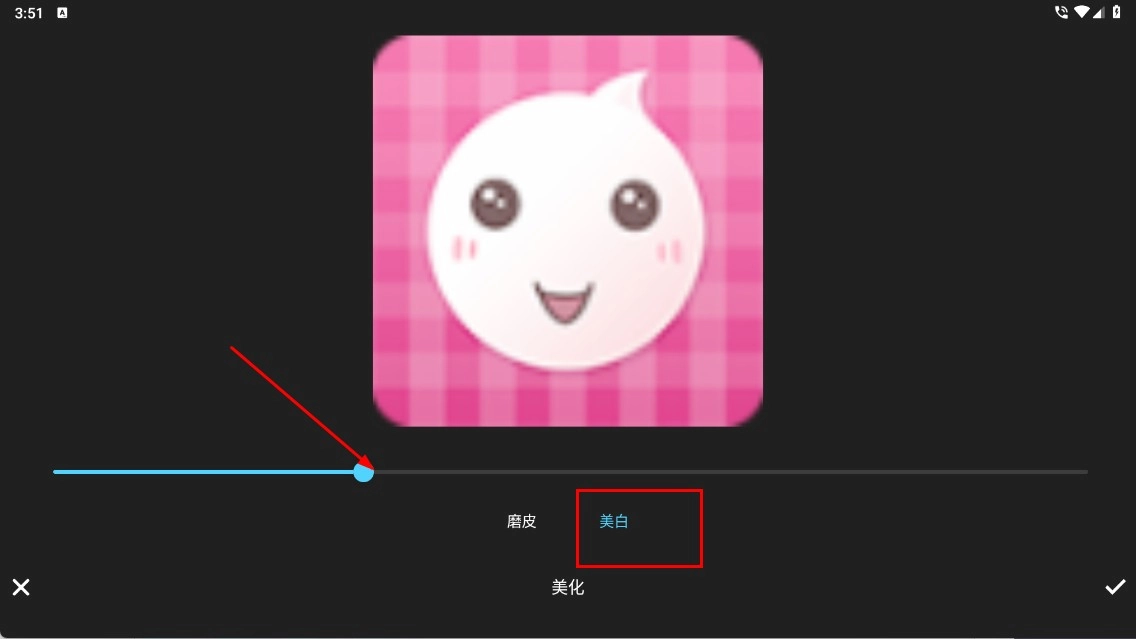 2、在美化界面,选择【美白】选项,拖动滑块调整美白程度,优化人像效果。
