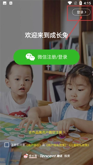 进入【成长兔】的初始页面后,能看到右上角的【登录】按钮,页面中还设有【微信注册/登录】选项,进行登录操作前需要先勾选相关协议。
