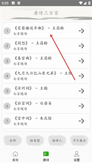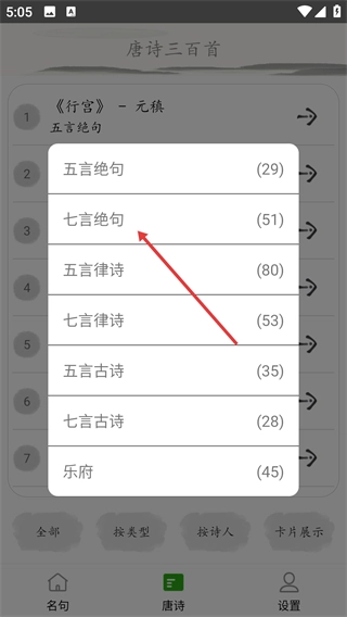 1、点击【按类型】选项后,会弹出诗词类型选择的交互菜单,通过该菜单可以筛选不同体裁的诗词。