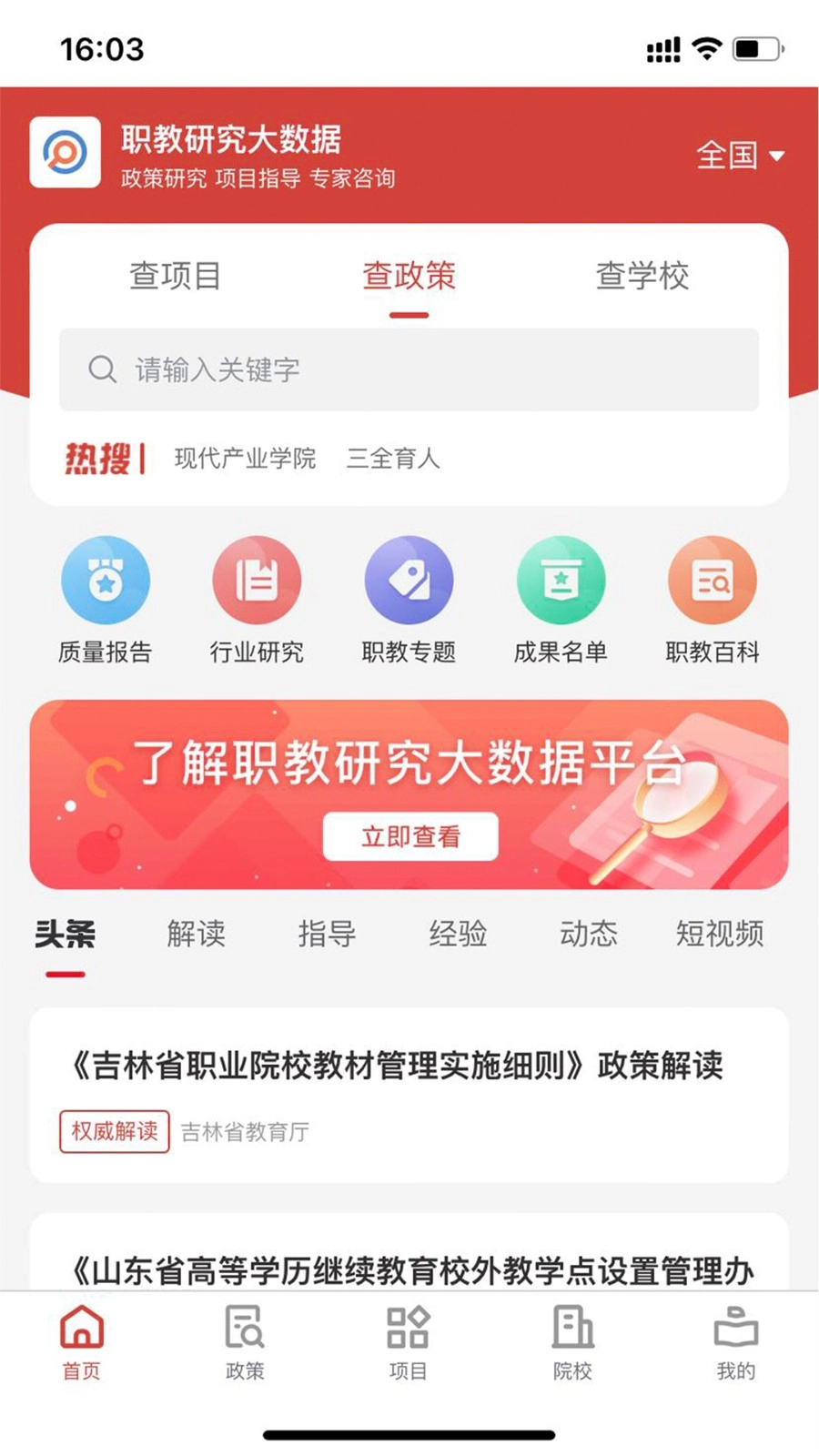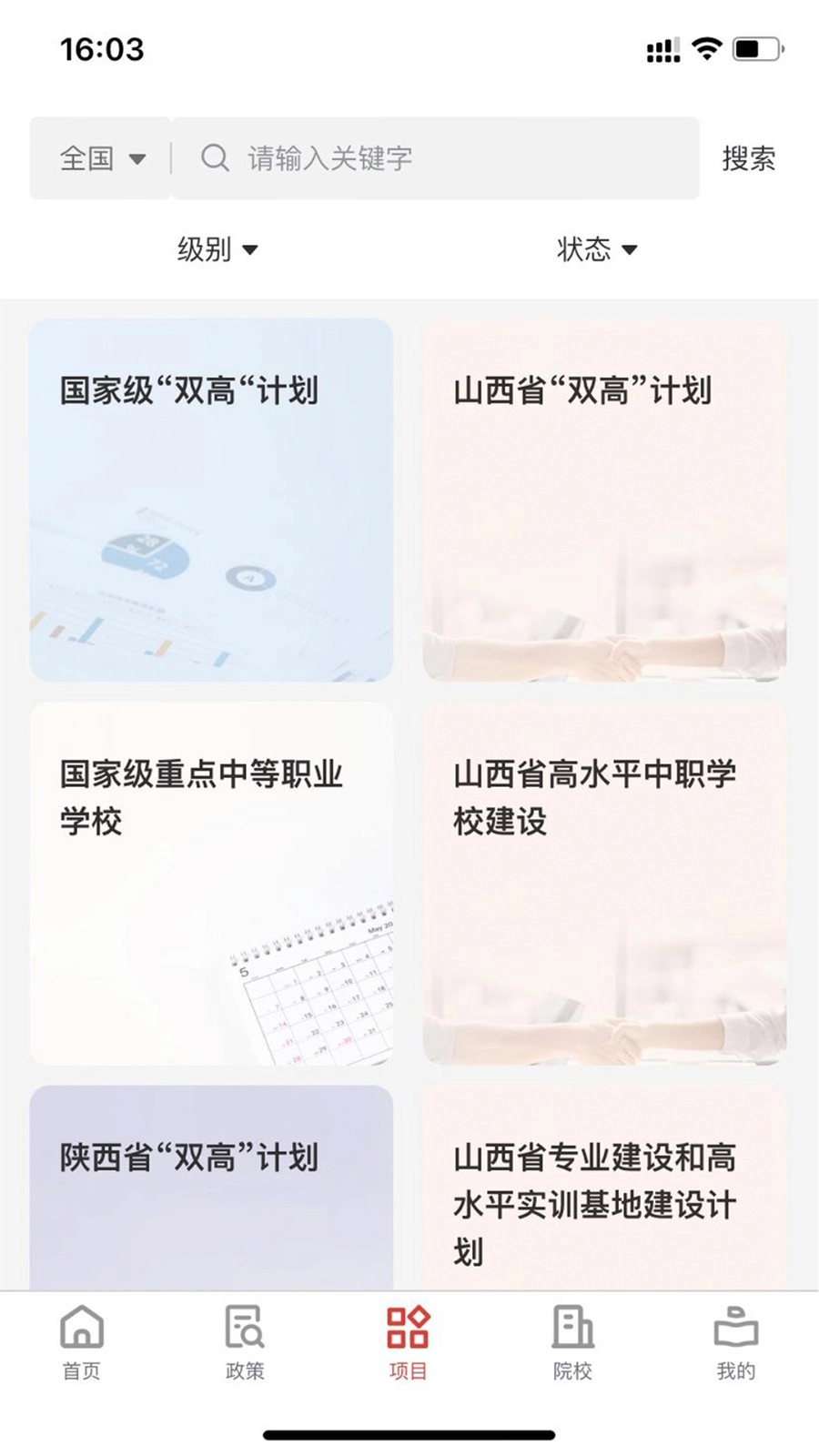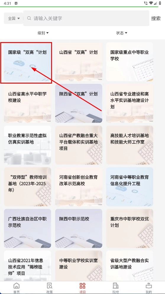 2、进入项目板块后,点击【国家级“双高”计划】,查看该计划相关政策与成果信息。