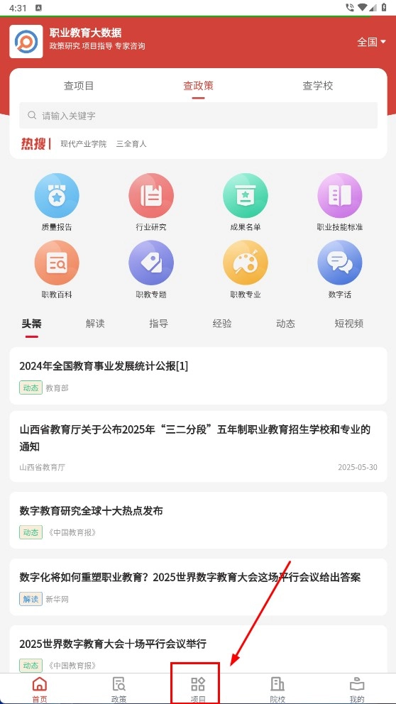 1、在职业教育大数据首页,点击【项目】选项,即可进入项目板块,探索职业教育相关的各类项目资源。