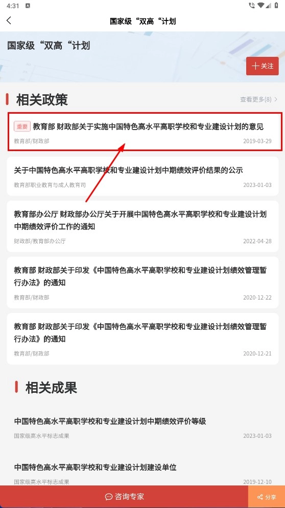 3、在国家级“双高”计划页,点击政策条目,如教育部-财政部的意见,查看政策详情。