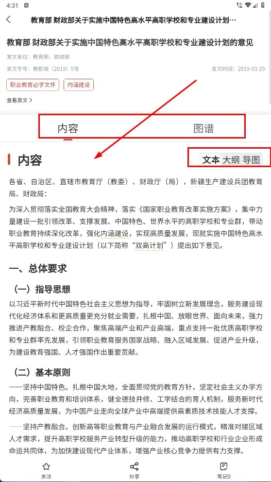 4、打开政策详情,可在【内容】-【文本】-【大纲】-【导图】间切换,浏览政策结构。