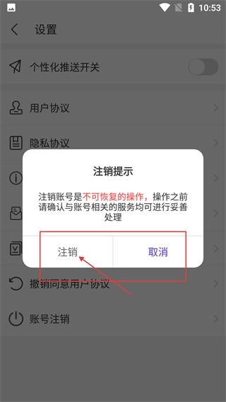 3、点击【账号注销】后会弹出【注销提示】弹窗,提示注销为不可恢复操作,需确认后选择【注销】继续流程。