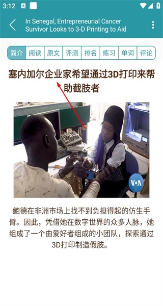 4、进入塞内加尔3D打印助截肢者文章详情界面,了解企业家制造假肢的故事,拓展科技认知。