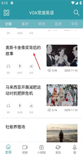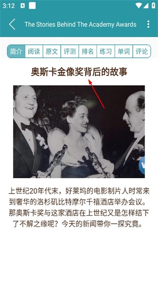 1、启动软件后,进入全部内容页面,该页面会展示多篇文章,从中选择《奥斯卡金像奖背后的故事》这篇文章,即可进入其详情界面。