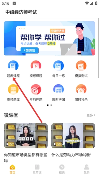 1、在中级经济师考试首页找到并点击【题库课程】选项,即可进入题库课程页面。