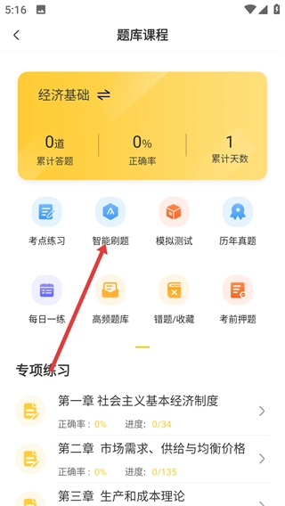 2、在题库课程页面点击【智能刷题】,进入智能刷题章节列表页面。