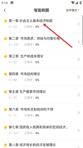 3、在章节列表中选择目标章节(如“第一章 社会主义基本经济制度”),进入刷题页面。