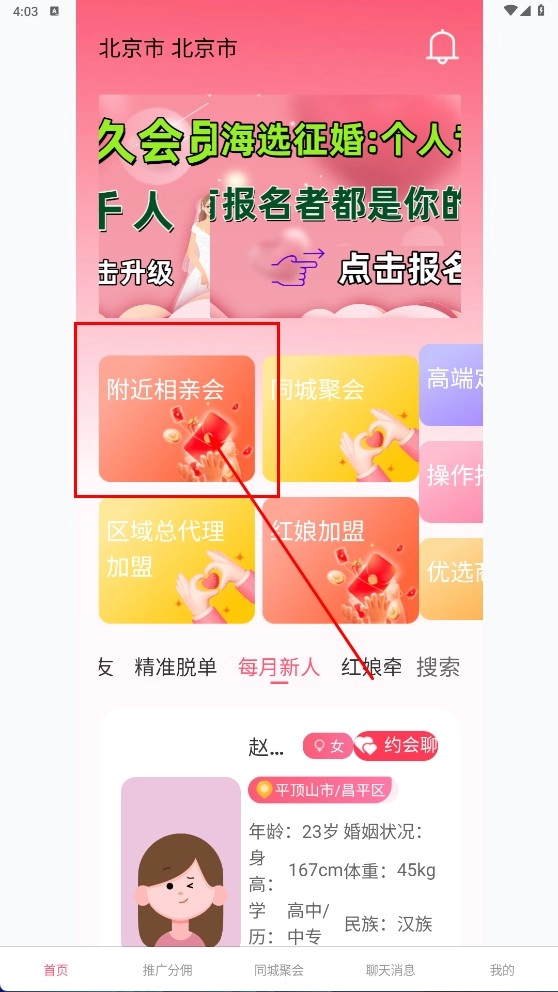 1、点击【附近相亲会】,即可查看周边的相亲活动以及参与人员的相关信息。