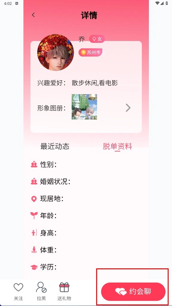 3、在用户详情页,点击【约会聊】,可发起聊天,进一步互动。