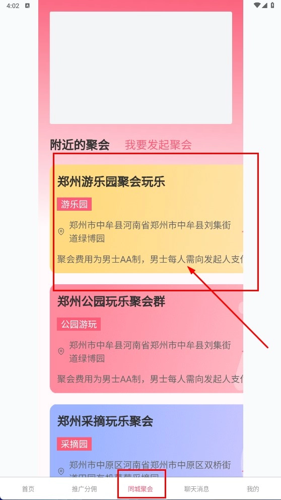 4、点击底部【同城聚会】,可查看“郑州游乐园聚会玩乐”等附近聚会活动,参与线下社交。