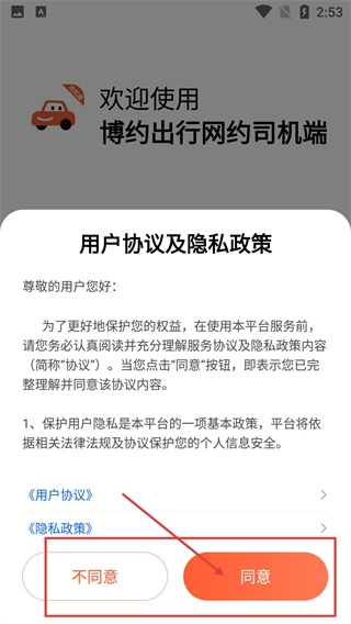 1、打开这款网约车司机端工具应用后,会弹出条款弹窗,阅读条款内容并点击【同意】按钮,即可进入手机号输入页面。