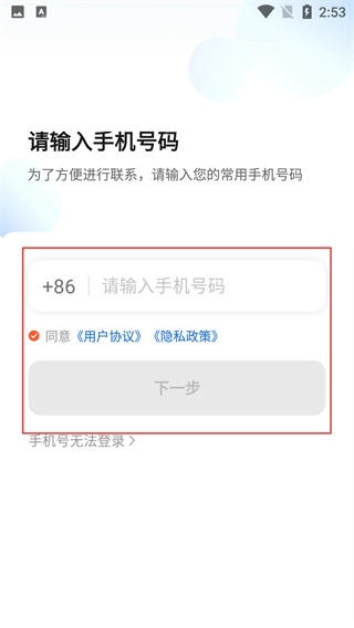 2、在手机号输入页面,填写常用手机号码并确认勾选协议,点击【下一步】发起验证码获取流程。