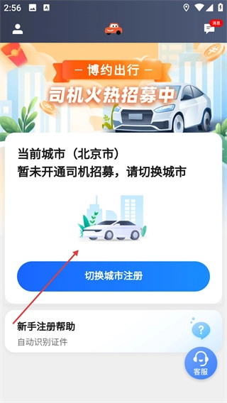 4、若当前城市(如北京市)未开通司机招募,点击【切换城市注册】,选择已开通招募的城市,继续完成司机注册流程。