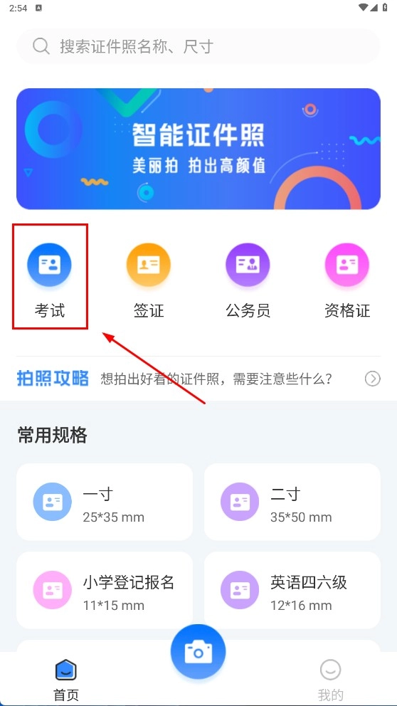 1、在首页找到并点击【考试】分类入口,即可进入考试类证件照的规格选择界面。