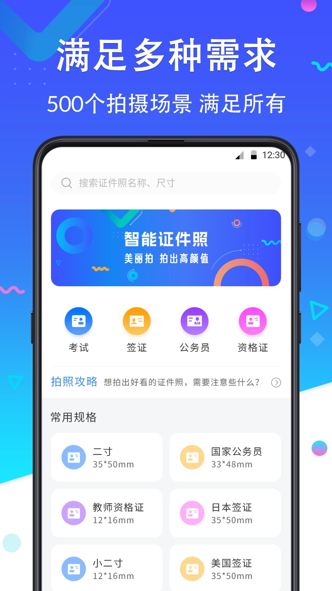 2、应用多种证件照模板,满足不同国家和地区对于证件照尺寸和背景色的要求。