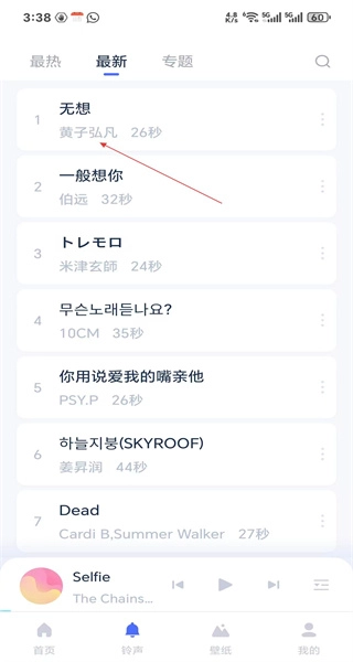 4、在铃声分类中切换到最新榜单,看到无想等铃声,可选择喜欢的铃声进行操作。