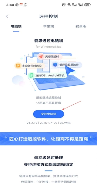 2、在远程控制界面,点击安装电脑端按钮,界面介绍了远程控制的功能。