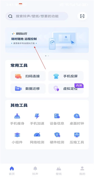 1、打开软件进入首页后,能看到智慧远程功能的入口,点击该入口即可进入远程控制界面;此外,首页还设有常用工具与其他工具这两个分类板块。