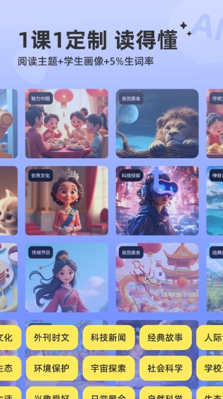 1、打造系统化英语教学体系 Paige通过可定制的难度层级、词汇范围、主题方向、篇幅长短及文体类型等维度,为孩子量身定制专属阅读材料。这些材料紧密贴合新课程标准要求,题型设计丰富多样,既覆盖学生感兴趣的内容,也包含各类高频考试话题,全方位助力学生提升听、说、读、写综合语言能力。