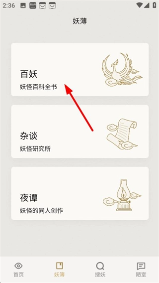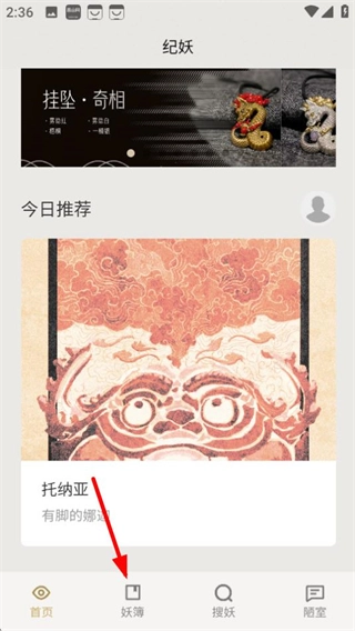1、首先进入纪妖首页,接着点击页面底部的妖簿选项,即可进入妖簿页面。